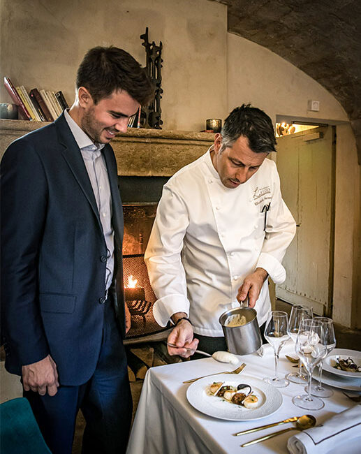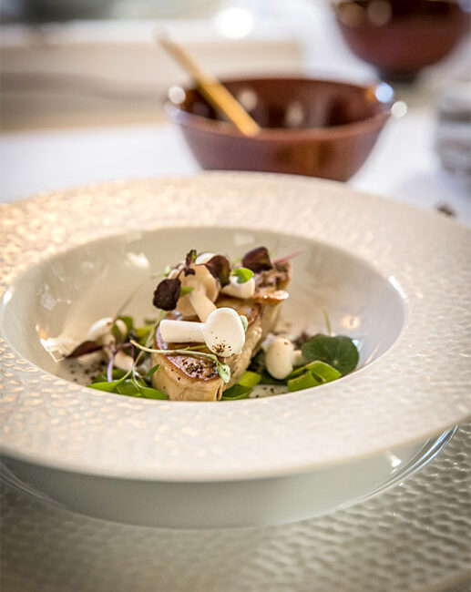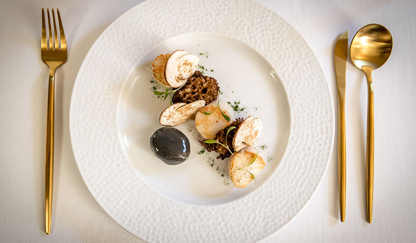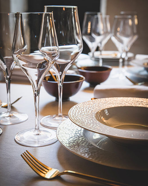 À l’image de l’ambiance sobre et feutrée de son restaurant, c’est finalement sur de la porcelaine blanche, un grand classique, que le choix de Christophe Ducros s’est porté. L’avantage de ce style ? Il se marie aussi facilement aux plats du Sud colorés proposés par la maison qu’aux repas plus traditionnels. Un point de vue que rejoint Alexandre Bastide, de la Maison familiale alésienne spécialisée dans l’art de la table « Une belle vaisselle en porcelaine blanche est toujours mise en valeur dès qu’elle est accessoirisée, par exemple lors de grandes occasions. » Sur la table de fêtes du chef, on retrouve un jeu de couverts dorés Table Passion, qui par leur forme élancée subliment l’éclat des assiettes. Facilement adaptable, une vaisselle épurée est un basique pour Christophe Ducros qui conclut : « Il y a des modes, des styles, mais au final je reviens toujours sur de la porcelaine blanche, c’est l’idéal. »