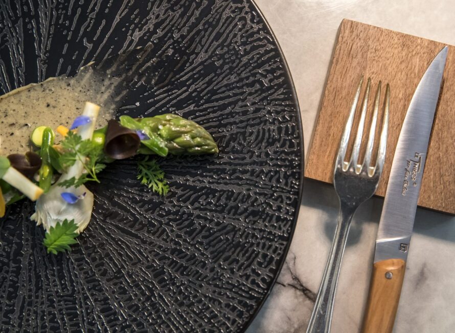 Ces nouveaux codes portent un nom : « le tabling ». Une tendance anglo-saxonne qui se traduit par « l’art de bien recevoir ». Durant l’interview, en dressant son plat dans une assiette en grès de la collection Santal (marque Table Passion, distribuée par Bastide), le chef Sébastien Rath explique : « J’ai choisi cette assiette pour son aspect naturel qui m’a inspiré le dressage d’un plat conçu avec des herbes cueillies ce matin au jardin. Les contrastes entre l’émail et le motif mat qui converge au centre offrent une belle perspective à l’asperge, travaillée rigoureusement et disposée au centre de l’assiette. »