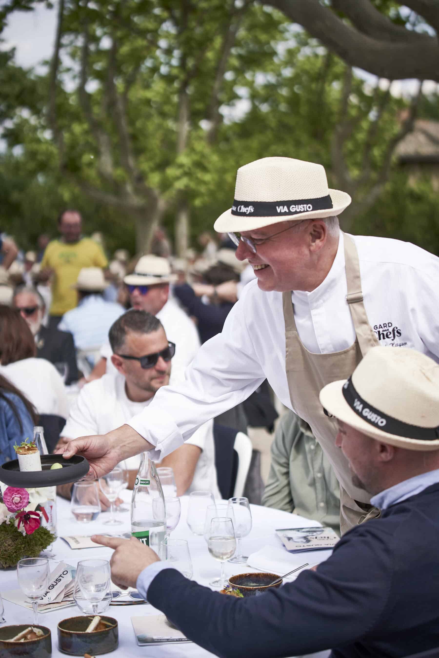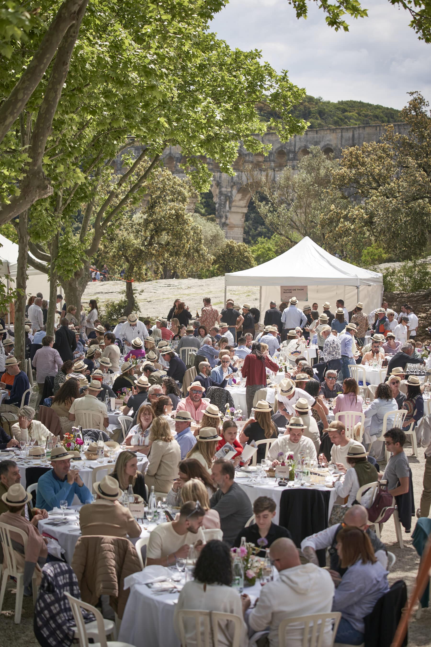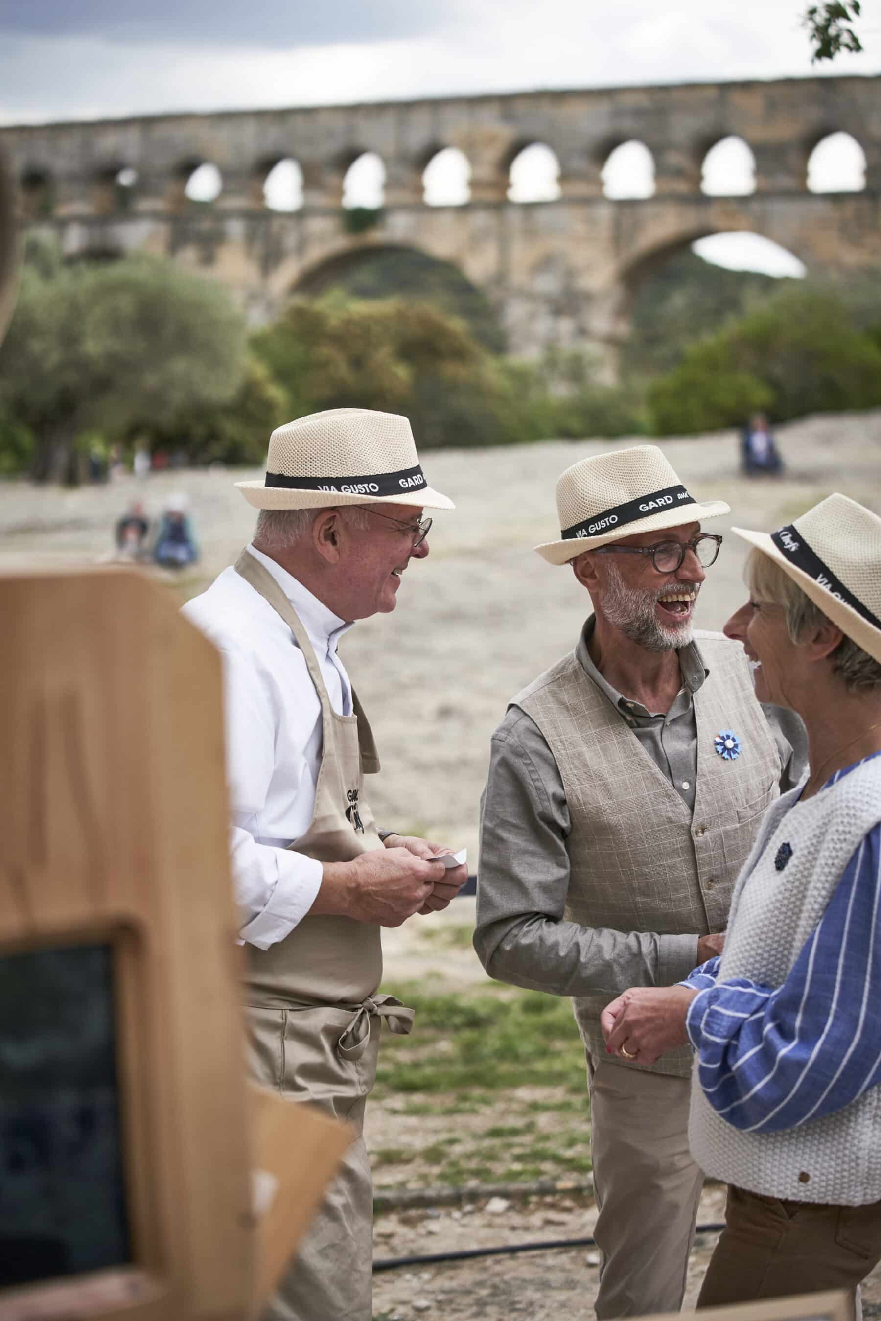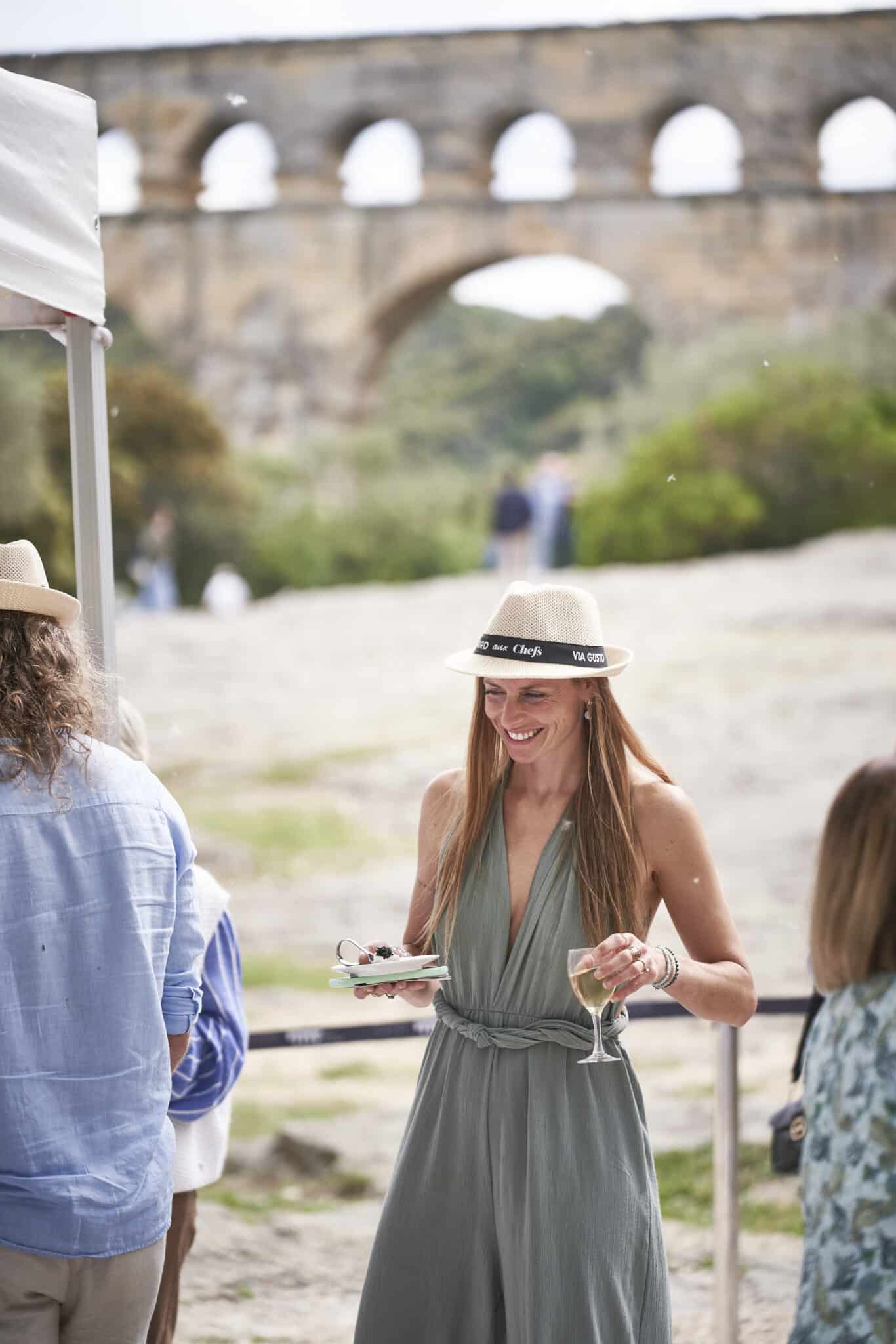 Le 8 mai, de 12h à 17h, le Pont du Gard a accueilli une nouvelle édition de Via Gusto, un rendez-vous pensé pour mettre en avant la cuisine gardoise à travers celles et ceux qui la font vivre : les chefs, les producteurs et les artisans. Aux côtés des domaines viticoles de l’association venus présenter leurs cuvées pour des accords mets et vins, ils ont partagé avec près de 400 convives.
